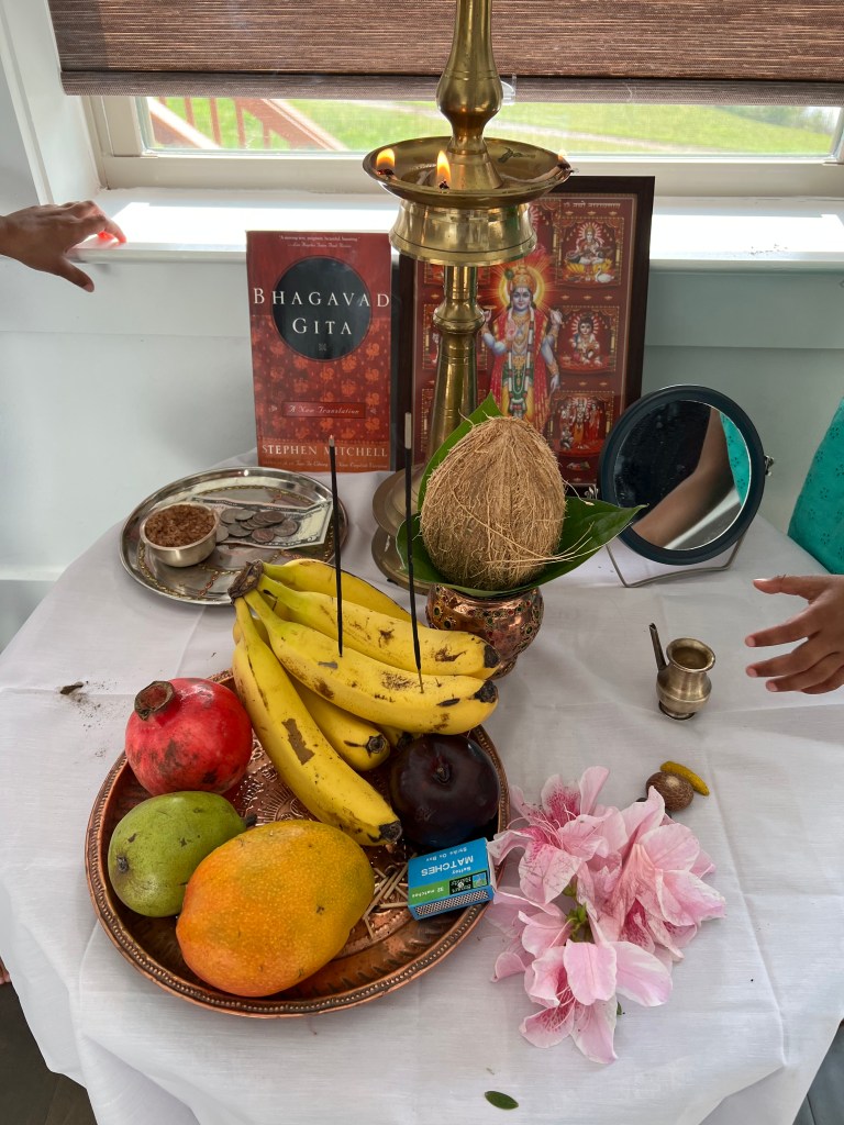 The day starts by viewing the Vishukani, a display of fruits and offerings with the traditional velekku (prayer lamp) lit, first thing in the morning before you look at anything else. Everyone is supposed to bathe before seeing the Vishukani, as it is customary to always bathe before praying or going to the temple. We have to cover the children’s eyes and guide them to the display so it is the first thing they lay eyes on in the new year. We then pray for blessings. I was able to do this in 2021 when all the kids were very young, but nowadays they are quite rowdy, so it didn’t happen exactly as planned, lol. But that’s ok! It is difficult enough to maintain holidays and traditions, but my goal is to make sure they are exposed to the traditions every year so they can learn about them and participate.